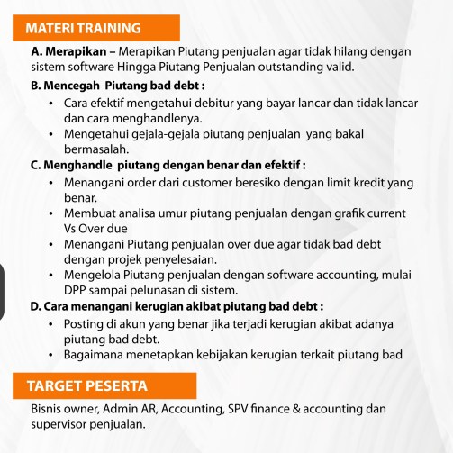 Target peserta : Bisnis owner, Admin AR, Accounting, SPV finance & accounting dan supervisor penjualan.